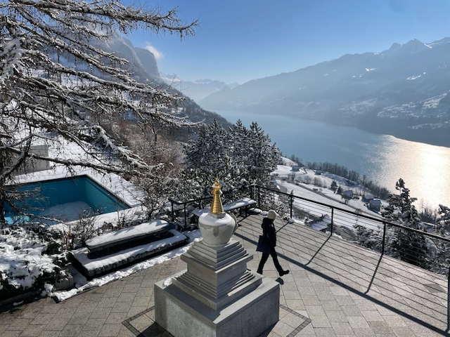Leider erlebte Rinpoche das Auffinden dieses wunderschönen Platzes in Amden nicht mehr. Nur wenige Wochen nach seinem Tod an Pfingsten 2003 besichtigten wir das Bellevue zum ersten Mal – der Ort sah genau so aus , wie er ihn beschrieben hatte! Wir sind jedoch davon überzeugt, dass er uns beim Finden der Retreatstelle aus den Reinen Ländern heraus den Weg gewiesen hat. Als wir Lama Ole direkt vom Besichtigungstermin anriefen und begeistert von der Stelle erzählten – «das ist sie!» -, verkündete er am selben Tag vor über tausend Phowakursteilnehmern in Kassel: «Schweizer freut euch, ihr habt eine Retreatstelle!». Das war ein starkes Stück «dynamischer Wahrheit», wir waren zutiefst beeindruckt und motiviert. Obwohl wir zu dem Zeitpunkt nur gerade 5000 Franken auf der hohen Kante hatten, zogen wir drei Monate später als frohe Besitzer ins Bellevue ein, kaum fassen könnend, wie uns geschah. Es war einfach unglaublich viel Segen dahinter: von Lopön Tsechu Rinpoche, von Lama Ole – und von der Erleuchtungsstupa.